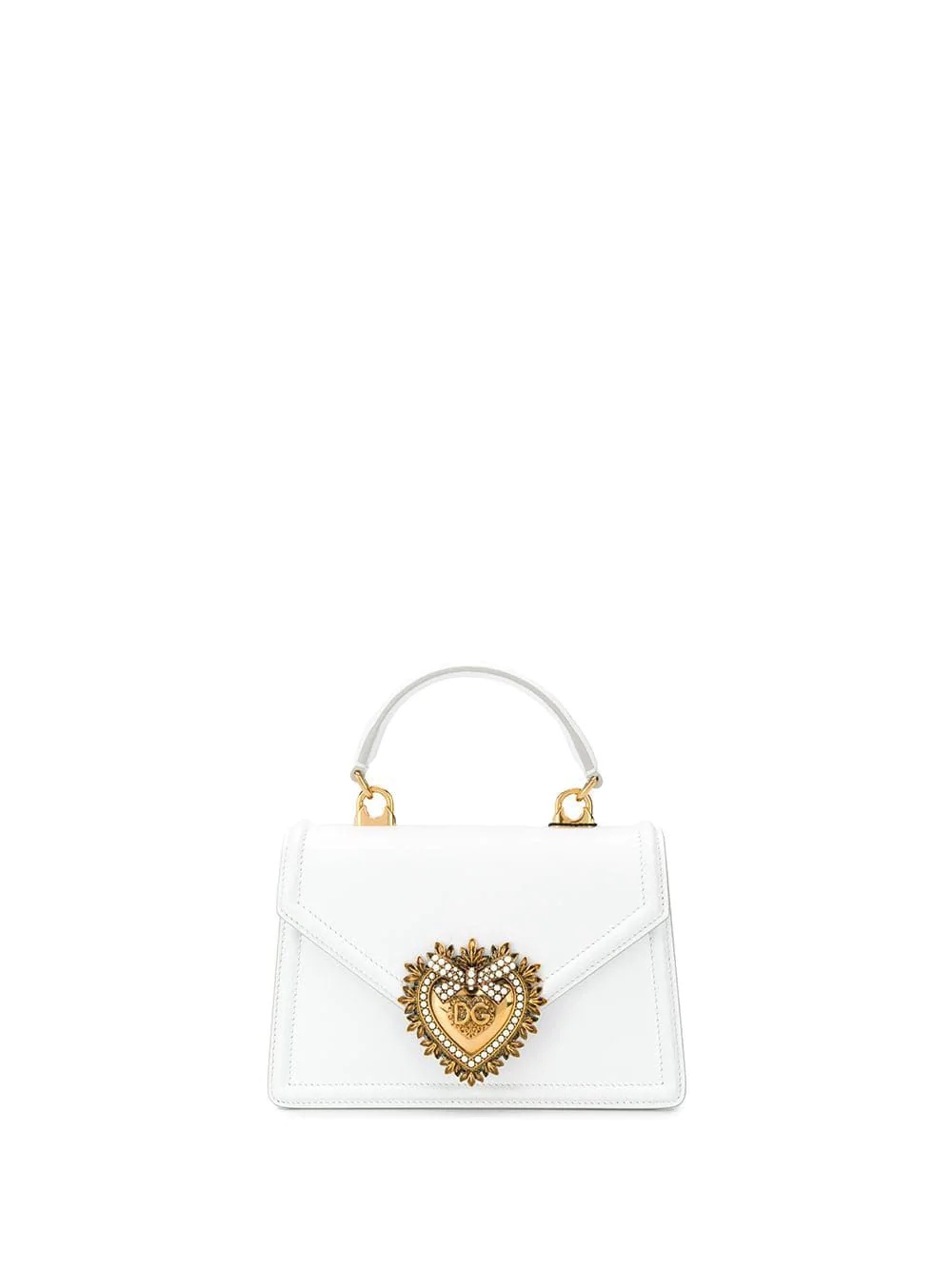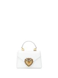 small Devotion tote bag Created to be an object of desire, Dolce & Gabbana presents this mini top-handle bag. Crafted from leather, this compact accessory has been embellished with the 'Devotion' sacred heart detail to the front and can be carried by the top handle or via the detachable chain-link shoulder strap. Highlights - White - Leather - Signature sacred heart plaque - Gold-tone hardware - Single top handle - Detachable chain-link shoulder strap - Foldover top with magnetic fastening - Main compartment - Internal slip pocket - Internal logo stamp - This piece comes complete with a protective dust bag. Made in Italy Composition Outer: Calf Leather 100% Lining: Calf Leather 100% SIZE & FIT Model measurements Height 5 ft 11 in(1.8 m) Bust/Chest 31.88 in(81 cm) Hips 35.43 in(90 cm) Waist 24.8 in(63 cm) Measurement WIDTH 7.08 in(18 cm) HEIGHT 4.72 in(12 cm) HANDLE 2.36 in(6 cm) DEPTH 1.57 in(4 cm) STRAP 19.68 in(50 cm)