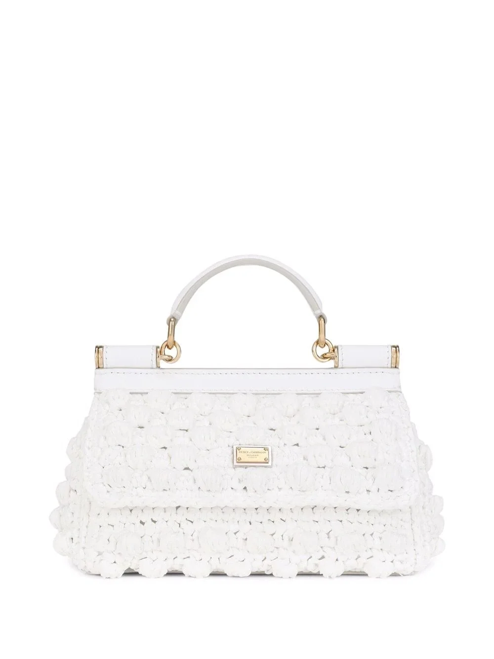 small Sicily raffia top-handle bag The Sicily bag from Dolce & Gabbana has cemented itself as an accessory classic. The timeless style is presented in a white crochet version for this small iteration, which is finished with gold-tone hardware. Highlights - White - Cotton - Crochet design - Logo plaque - Gold-tone hardware - Single top handle - Adjustable detachable shoulder strap - Front flap closure - Magnetic fastening - Main compartment - This piece comes complete with a protective dust bag. Made in Italy Composition Outer: Rayon 85%, Calf Leather 15% Lining: Cotton 80%, Calf Leather 20%