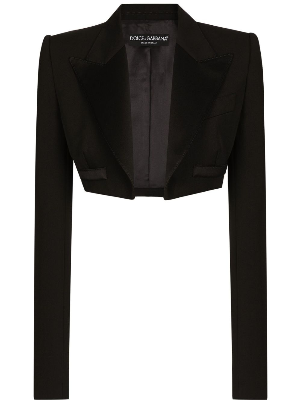 Spencer jacket Highlights - Black - Wool blend - Satin trim - Gabardine weave - Open front - Peak lapels - Shoulder pads - Long sleeves - Faux pocket detail - Buttoned cuffs - Cropped - Straight hem Made in Italy Composition Outer: Wool 86%, Silk 11%, Spandex/Elastane 3% Lining: Silk 100%
