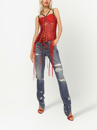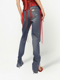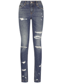 Girly distressed skinny jeans Dolce & Gabbana reimagine the skinny jean by combining a distressed finish with an extra-long flare. Mirroring their bold expression through the denim design. Highlights - Split-hem extra-long skinny jeans from dolce & gabbana featuring indigo blue, stretch-cotton, distressed effect, faded effect, ripped detailing, classic five pockets, logo patch to the rear, button fly fastening, side slits and extra-long length. Made in Italy Composition Cotton 98%, Spandex/Elastane 2%