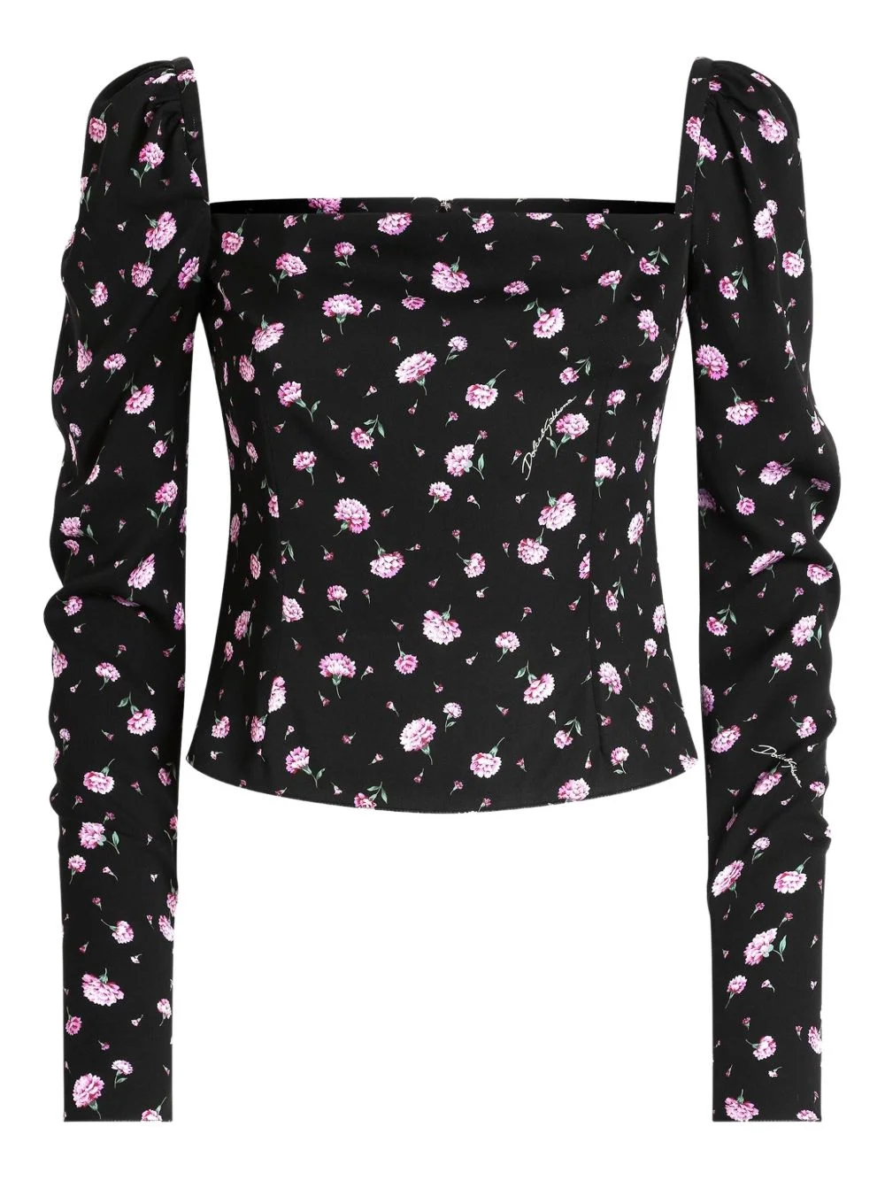 square-neck floral blouse Highlights - Black - Floral print - Square neck - Long sleeves - Rear zip fastening Made in Italy Composition Silk 89%, Spandex/Elastane 11% Washing instructions Read Manufacturer Guidelines