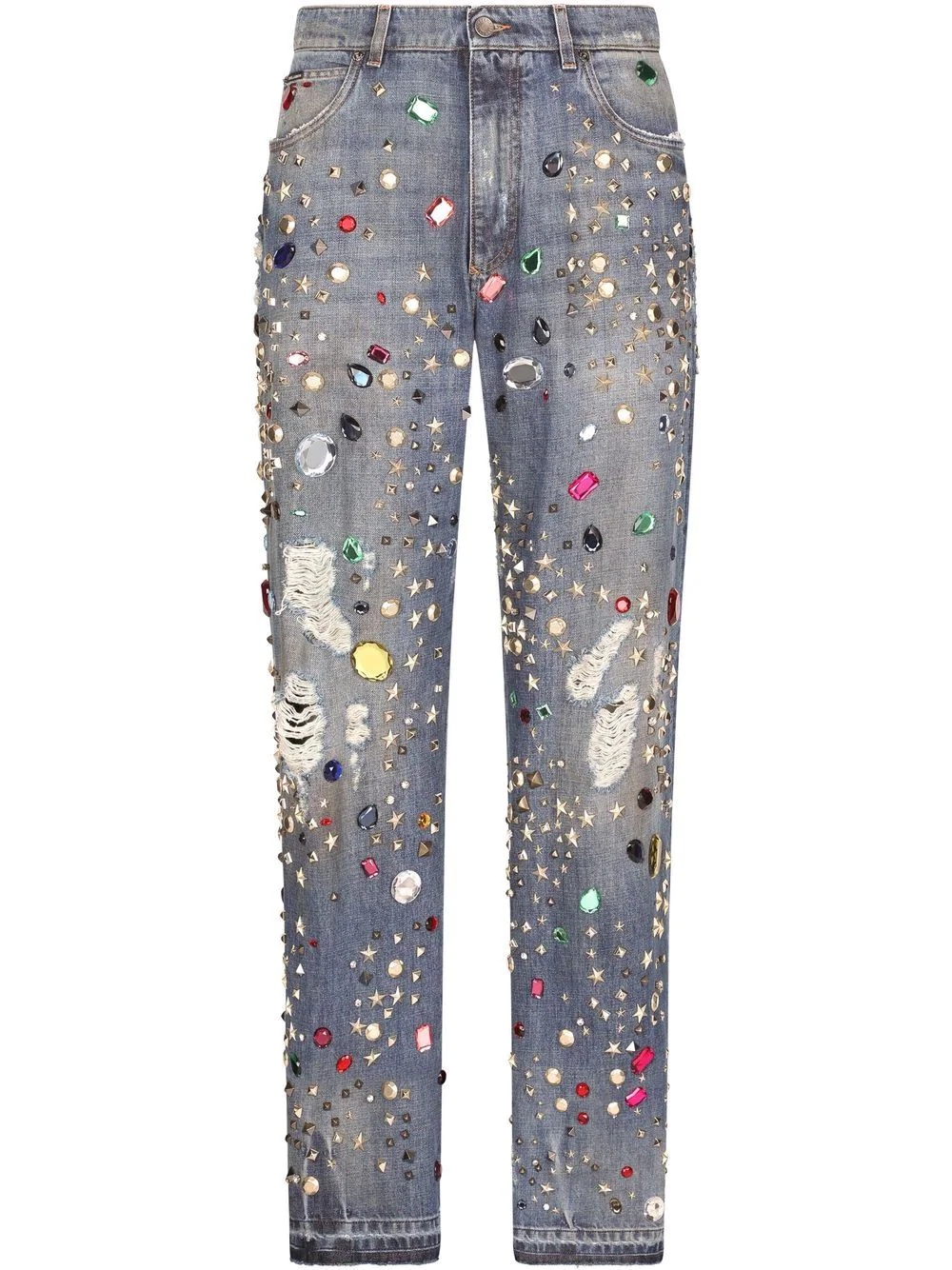 embellished straight-leg jeans Highlights - Blue cotton stone-embellished jeans from dolce & gabbana featuring stud embellishment, crystal embellishment, button fastening, two front pouch pockets, belt loops, straight hem, silver-tone logo plaque and ripped detailing. Made in Italy Composition Cotton 100%