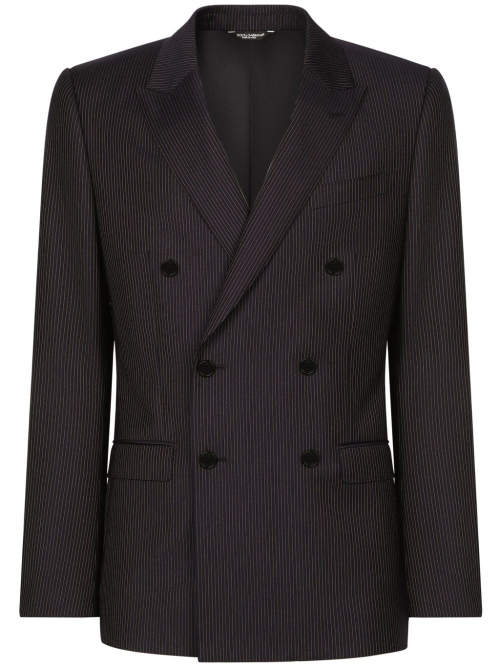 striped double-breasted two-piece suit Designed from pure virgin wool, this Dolce & Gabbana two-piece suit is presented in a tonal black design. With a double-breasted fastening, it's patterned with vertical stripes. Highlights - Black - Virgin wool - Vertical stripe pattern - Peak lapels - Double-breasted button fastening - Chest welt pocket - Two front flap pockets - Long sleeves - Buttoned cuffs - Straight hem - Full lining - Slim leg - Button fly fastening - Belt loops - Two rear welt pockets - Ankle-length Made in Italy Composition Virgin Wool 100% Washing instructions Read Manufacturer Guidelines