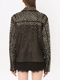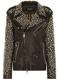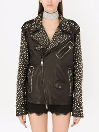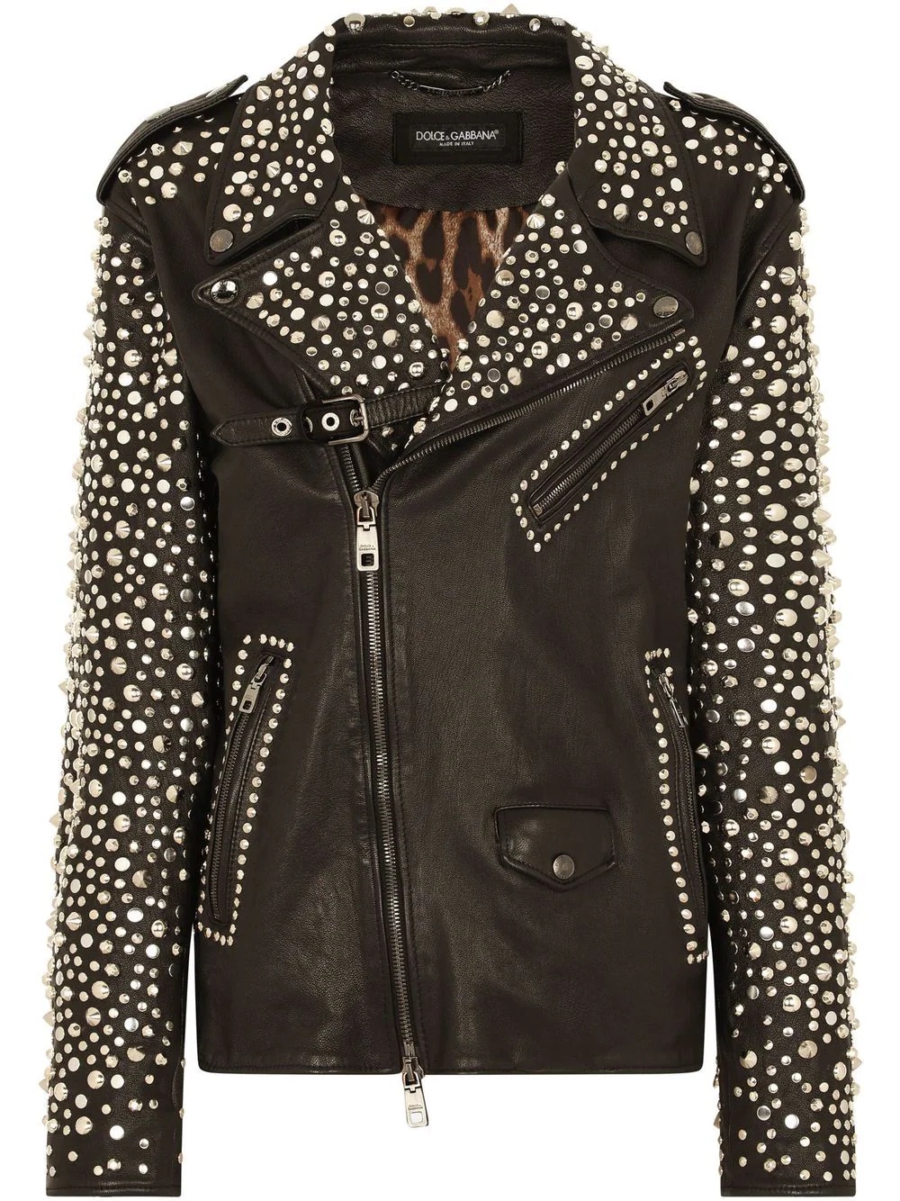 studded leather biker jacket This leather jacket from Dolce & Gabbana's SS22 collection exhibits the brand's signature leopard print, showcased at the lining. Meanwhile, delicate stud-embellishment depicts the brand's maximalist style. Highlights - Black - Stud embellishment - Front zip fastening - Long sleeves - Cuff zips - Side zip-fastening pocket - Zip-fastening chest pocket - Leopard print lining Made in Italy Composition Outer: Goat Skin 100% Lining: Polyester 97%, Spandex/Elastane 3%