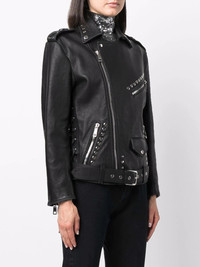 studded belted biker jacket With a smooth leather construction in a black colourway, this biker jacket from Dolce & Gabbana is adorned with silver-tone stud embellishments and finished with a waist belt. Made in Italy Composition Outer: Bullhide Leather 100% Lining: Polyester 97%, Spandex/Elastane 3% SIZE & FIT Model measurements Height 5 ft 11 in(1.8 m) Bust/Chest 33.07 in(84 cm) Hips 37.4 in(95 cm) Waist 25.19 in(64 cm) FittingInformation This piece fits true to size. We recommend you get your regular size Cut for a loose fit Made with a heavyweight fabric Measurement SLEEVE LENGTH 24.01 in(61 cm) LENGTH 25.59 in(65 cm) Washing instructions Specialist Cleaning