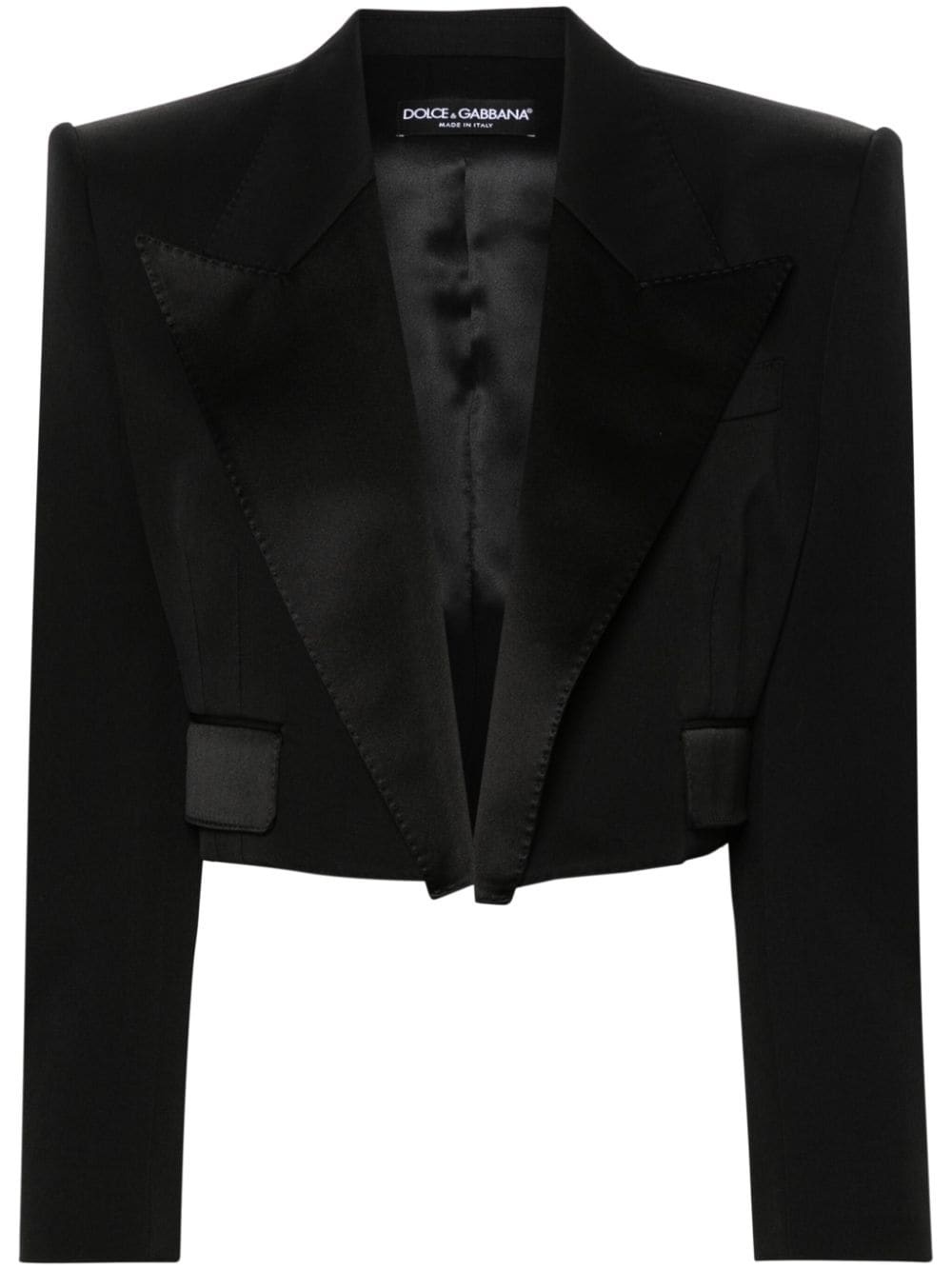 tailored cropped blazer A truncated take on formal eveningwear, this black Dolce & Gabbana tuxedo jacket is precisely cut to a cropped silhouette with lustrous Duchesse peak lapels. It's made with virgin wool and finished with buttoned-cuff sleeves, faux flap pockets and a silk-satin lining. Highlights - Black - Virgin wool-silk blend - Twill weave - Decorative stitching - Tailored design - Peak lapels - Shoulder pads - Chest welt pocket - Long sleeves with buttoned cuffs - Fabric-covered buttons - Dart detailing - Faux flap-pocket detail to the front - Cropped - Straight hem - Full silk lining - Open front Made in Italy Composition Outer: Virgin Wool 80%, Silk 16%, Polyester 4% Lining: Silk 100% SIZE & FIT Model measurements Height 5 ft 11 in(1.8 m) Bust/Chest 30.7 in(78 cm) Hips 35.03 in(89 cm) Waist 24.4 in(62 cm) FittingInformation Designed to be unstructured, offering a loose fit throughout The internal shoulder pads offer a structured shape Made from a midweight non-stretch fabric This piece fits true to size – take your usual size