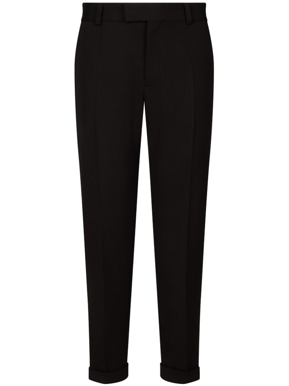 pressed-crease tapered trousers Highlights - Black - Twill weave - Pressed crease - Mid-rise - Concealed front button, hook and zip fastening - Tapered leg - Slip pockets to the sides Made in Italy Composition Polyester 54%, Wool 44%, Spandex/Elastane 2%