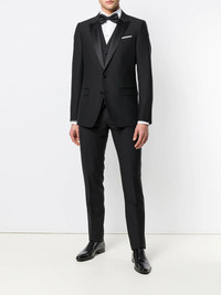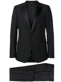 three-piece dinner suit When it comes to formal occasions, nothing quite beats Italian tailoring and this dinner suit from Dolce & Gabbana ticks all the style boxes. Crafted from a blend of virgin wool and silk in slick black, this set is composed of three pieces. Firstly, the blazer jacket displays peaked notched lapels, a front button fastening, long sleeves with button cuffs, a chest and front flap pockets and a rear central vent, layering a v-neck waistcoat with a front button fastening, two front pockets and an adjustable backstrap. The slim fitted trousers feature a waistband with belt loops, a button and zip fly, side slit pockets, two back buttoned welt pockets, a regular length and avant-garde applique stripes at the sides. Made in Italy Composition Outer: Virgin Wool 90%, Silk 7%, Polyester 3% Lining: Viscose 70%, Cupro 30% SIZE & FIT Model measurements Height 6 ft 2 in(1.87 m) Bust/Chest 37.79 in(96 cm) Hips 37.79 in(96 cm) Waist 30.31 in(77 cm) Measurement CHEST 39.37 in(100 cm) SLEEVE LENGTH 26.77 in(68 cm) FRONT RISE 8.66 in(22 cm) INSIDE LEG 37.79 in(96 cm) HIPS 40.15 in(102 cm) LENGTH 29.92 in(76 cm) WAIST 33.85 in(86 cm) Washing instructions Dry Clean Only