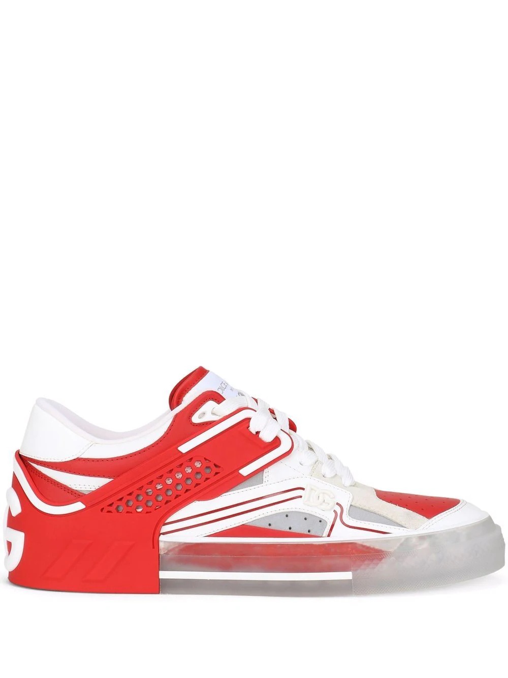 transparent cut-out sneakers red/silver-tone transparent design cut-out detailing logo-print tongue round toe front lace-up fastening branded insole flat rubber sole Made in Italy Composition Outer: Calf Leather 80%, Nylon 10%, Acrylic 10% Lining: Nylon 70%, Lambskin 20%, Elastane 10% Sole: Rubber 100%