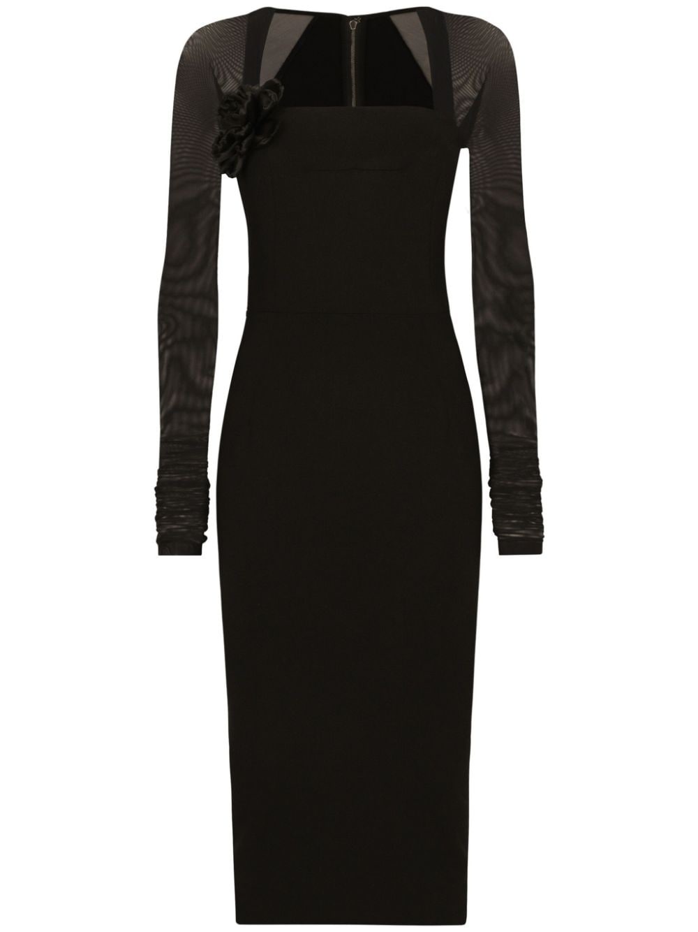 tulle-sleeve midi dress Defined by its tulle overlay, this dress by Dolce & Gabbana boasts semi-sheer sleeves that confer a subtle sensuality. The fitted silhouette features an elegant square neck and some floral appliques, ending at the knee with a straight hem. Highlights - Black - Stretch-design - Layered design - Tulle overlay - Floral applique - Square neck - Long sleeves - Concealed rear zip fastening - Straight hem - Below-knee length Made in Italy Composition Rayon 50%, Nylon 46%, Spandex/Elastane 4% Washing instructions Read Manufacturer Guidelines