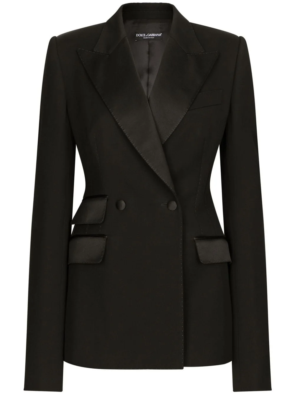 Turlignton double-breasted blazer Defined by its sharp, tailored cut, the Turlington blazer is one of Dolce & Gabbana's recurring styles. This virgin wool crepe iteration is defined by its entire black design and contrasting satin peak lapels. Highlights - Black - Virgin wool/silk blend - Crepe texture - Tailored design - Satin peak lapels - Double-breasted button fastening - Shoulder pads - Long sleeves - Buttoned cuffs - Chest welt pocket - Front flap pockets - Straight hem - Full lining Made in Italy Composition Virgin Wool 80%, Silk 14%, Polyester 6% Washing instructions Read Manufacturer Guidelines