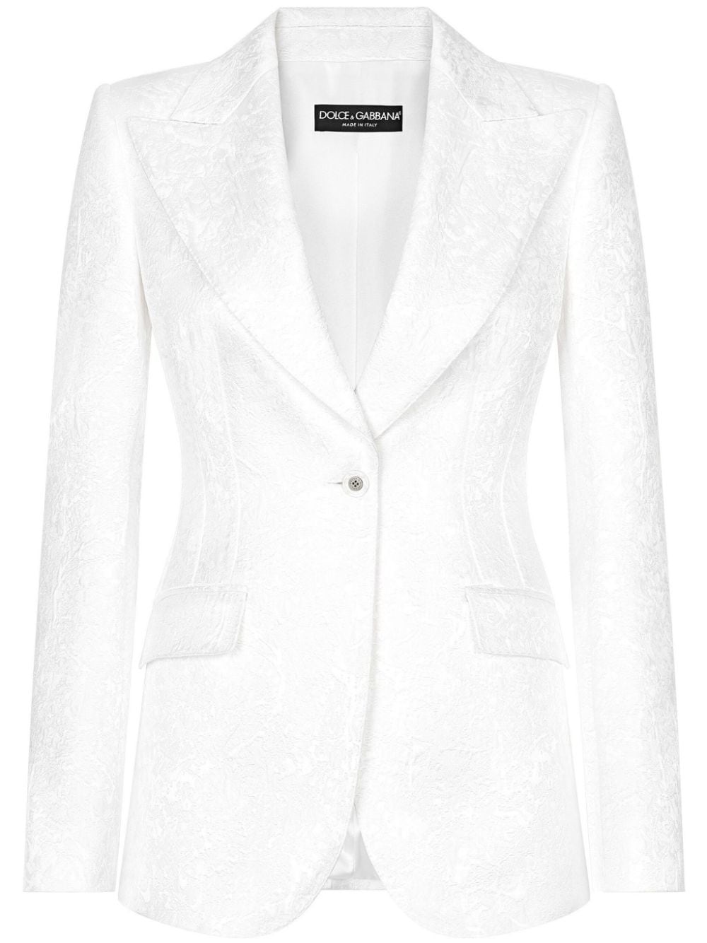 Turlington single-breasted blazer Highlights - White - Silk/cotton blend - Patterned jacquard - Wide notch lapels - Front button fastening - Long sleeves - Buttoned cuffs - Chest welt pocket - Two front flap pockets - Straight hem - Full lining Made in Italy Composition Outer: Cotton 64%, Rayon 36% Lining: Silk 100% SIZE & FIT Measurement SLEEVE LENGTH 24.4 in(62 cm) LENGTH 31.49 in(80 cm) WAIST 35.43 in(90 cm)