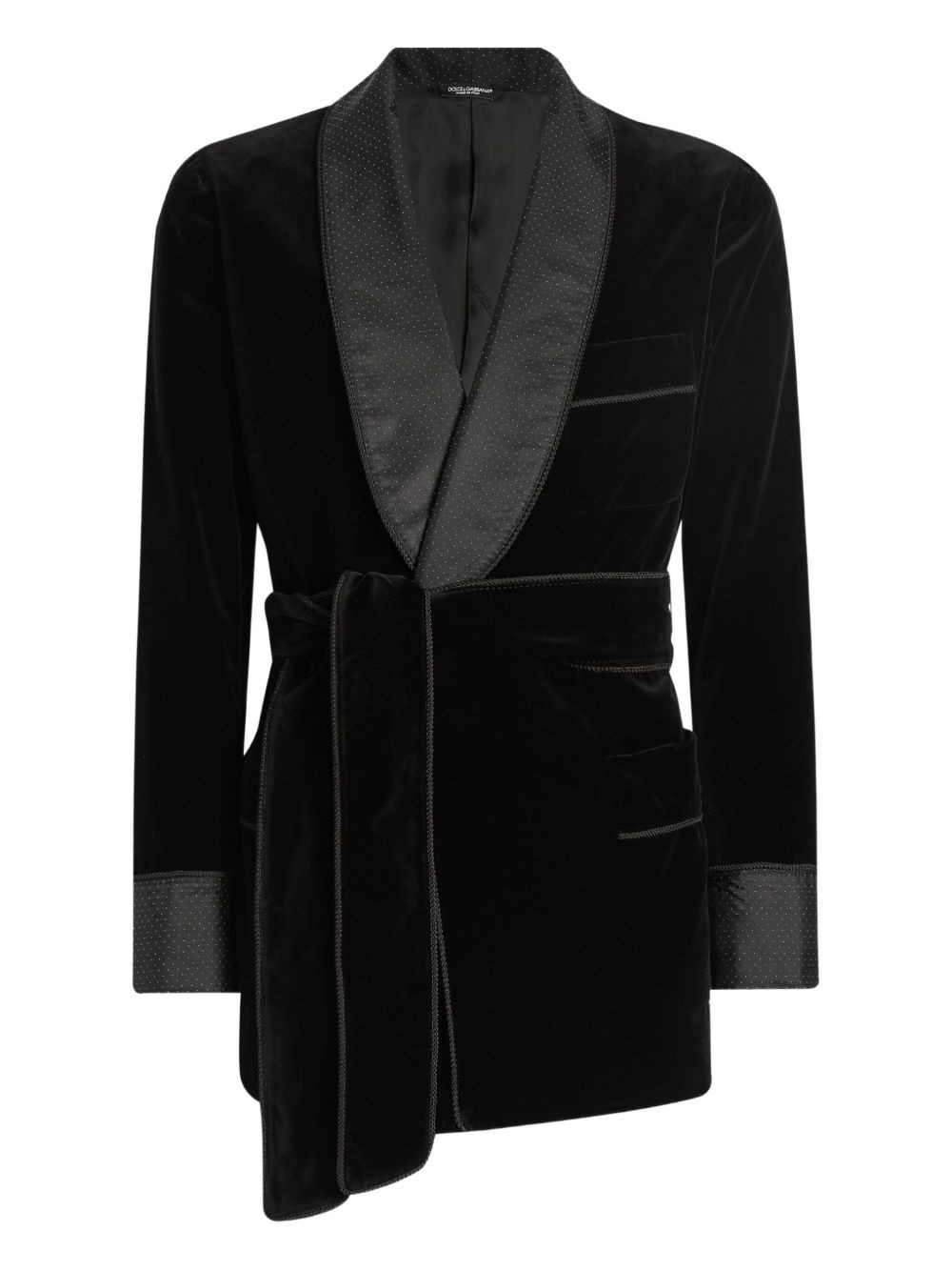 velvet shawl-collar blazer Highlights - Black - Velvet texture - Shawl collar - Self-tie belt - Piped trim - Patch pockets Made in Italy Composition Lining: Viscose 100% Outer: Cotton 79%, Silk 21% Washing instructions Read Manufacturer Guidelines