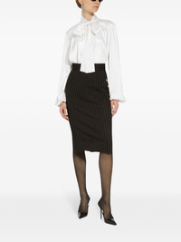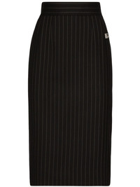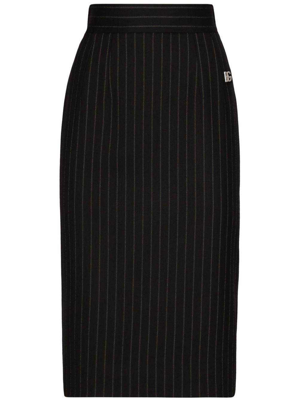 virgin wool-blend pinstripe midi skirt Spun from a blend of virgin wool, this Dolce & Gabbana midi skirt is detailed with pinstripes and the signature logo. Highlights - Black - Virgin wool blend - Stretch-design - Pinstripe pattern - Logo patch to the side - Knee-length Made in Italy Composition Virgin Wool 96%, Elastane 2%, Polyester 2%