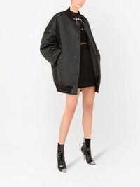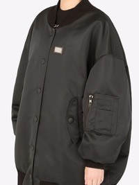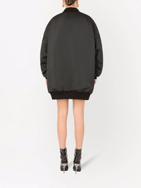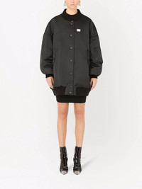 logo-tag duchesse bomber jacket Highlights - Black wide-style bomber coat from dolce & gabbana featuring logo patch to the front, round neck, front press-stud fastening, front flap pockets, long sleeves and straight hem. Made in Italy Composition Polyester 100%