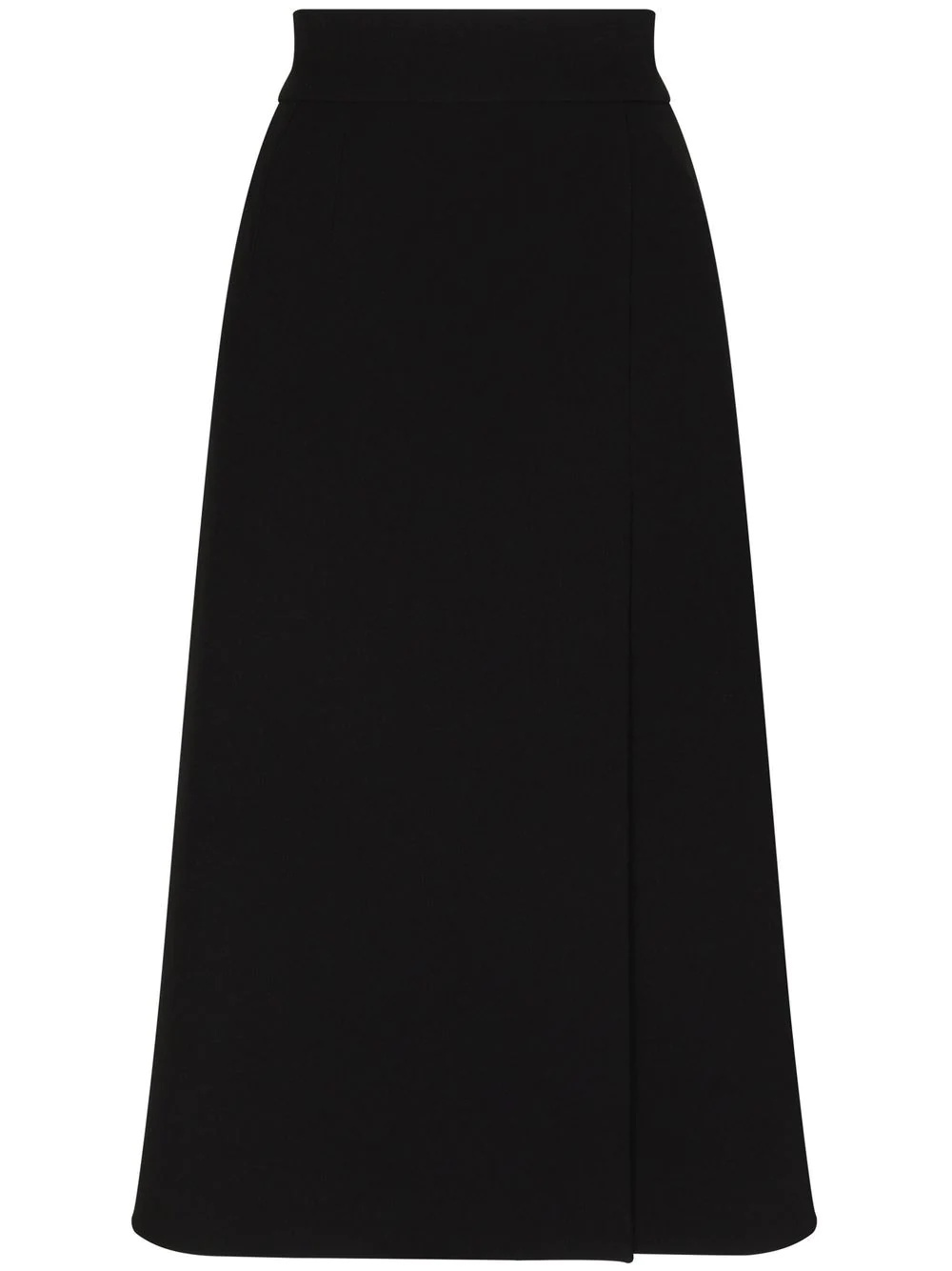 slit-detail crepe midi skirt This wool-blend midi skirt from Dolce & Gabbana proves both elegant and timeless in its sophisticated design. Crafted in a tonal black hue, the graceful A-line silhouette is interrupted by a side-slit detail for a sultry edge. Highlights - Black - Virgin wool blend - High waist - A-line - Side slit - Mid-length Made in Italy Composition Virgin Wool 85%, Nylon 14%, Elastane 1% Washing instructions Specialist Cleaning