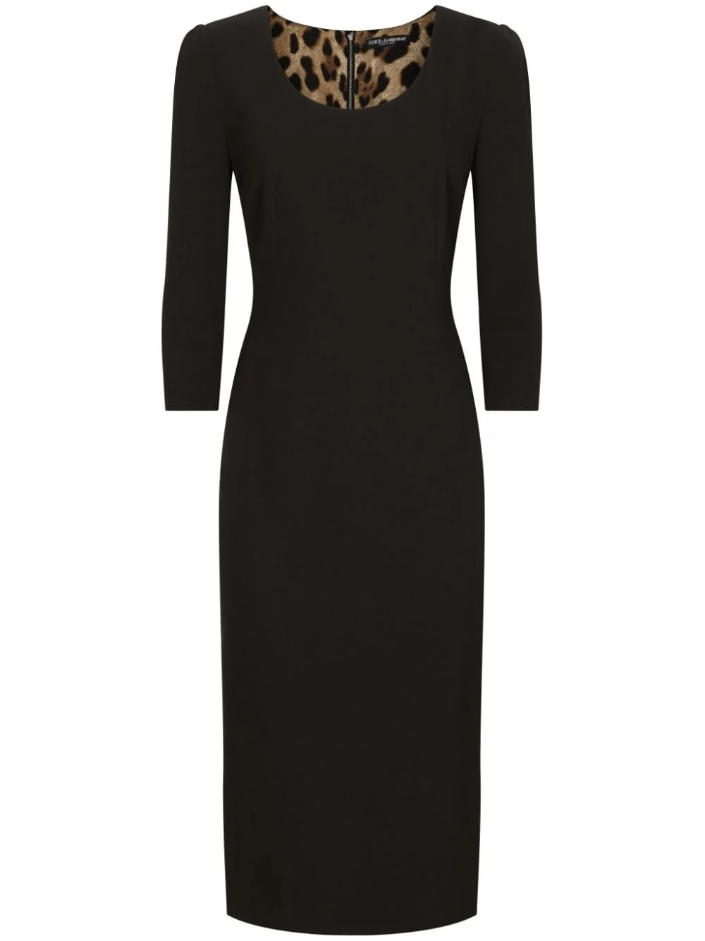 wool-blend midi dress Part of Dolce & Gabanna’s Essential collection, this black midi dress is defined by its stretch-wool construction. It’s framed with a scoop neck and three-quarter-length sleeves. Highlights - Black - Virgin wool blend - Contrast lining - Scoop neck - Three-quarter length sleeves - Fitted waistline - Concealed rear hook and zip fastening - Rear slit - Straight hem - Below-knee length Made in Italy Composition Virgin Wool 97%, Spandex/Elastane 3% Washing instructions Read Manufacturer Guidelines