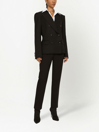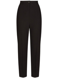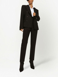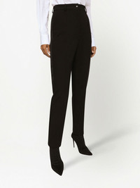 tuxedo-band tailored trousers Dolce & Gabbana briefly moves away from its extravagant signature style with these minimalistic tailored trousers. The fashion house’s bold style is yet channelled through the subtle silk panelling. Highlights - Black - Virgin wool blend - Silk panelling - Dart detailing - Logo-embossed buttons - Button fly fastening - High waist - Belt loops - Tailored cut - Ankle-length Made in Italy Composition Virgin Wool 81%, Silk 14%, Polyester 4%, Spandex/Elastane 1%