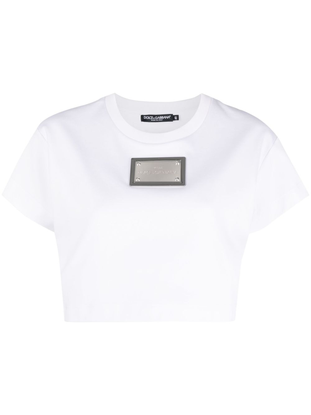 x KIM DOLCE&GABBANA logo plaque cropped T-shirt This T-shirt is part of Dolce&Gabbana's collaborative collection with Kim Kardashian. The edit includes reinterpretations from the brand's archives. This T-shirt boasts a logo plaque engraved with the influencer's name. Made in Italy Composition Outer: Cotton 100%, Brass 60%, Acrylonitrile Butadiene Styrene (ABS) 40% Lining: Cotton 100% SIZE & FIT Model measurements Height 5 ft 10 in(1.79 m) Bust/Chest 31.1 in(79 cm) Hips 35.03 in(89 cm) Waist 24.01 in(61 cm)