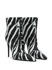 zebra-print ankle boots black/white lambskin/goatskin/leather zebra print pointed toe silver-tone logo plaque ankle-length flat leather sole high stiletto heel Made in Italy Composition Lining: Goat Skin 100% Sole: Leather 100% Outer: Lambskin 100%
