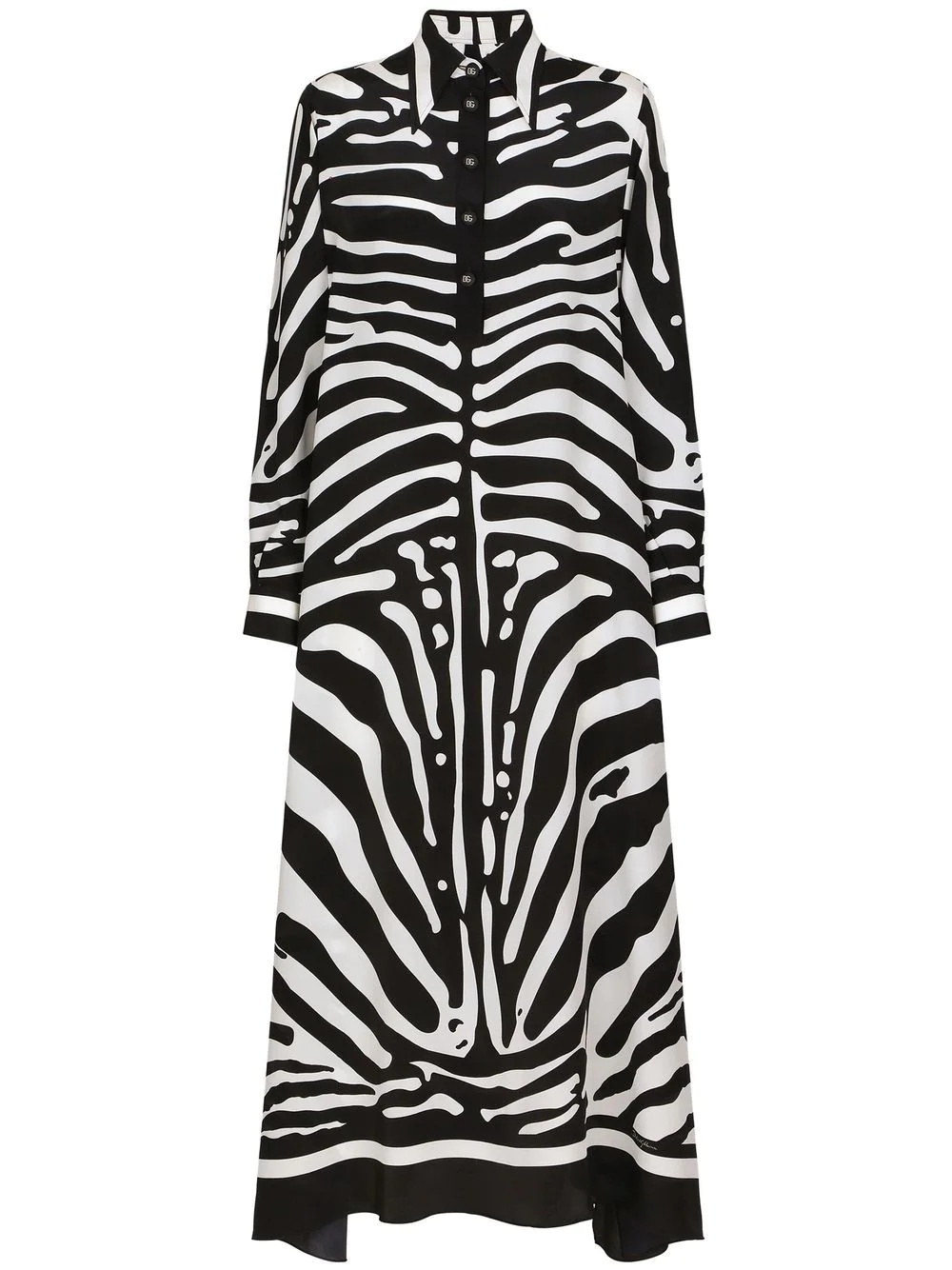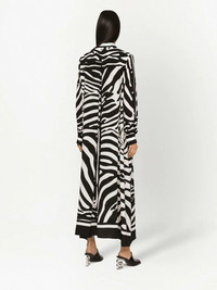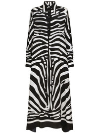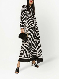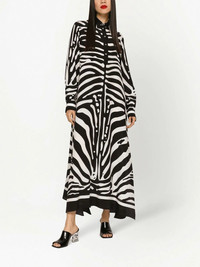 zebra-print crepe-de-chine kaftan Distinctively Dolce & Gabbana, this kaftan shirt dress is characterised by the brand's new season zebra print and made from a lustrous silk crepe de chine. Luxurious materials and bold motifs are two pillars of the brand's DNA, and this eye-catching piece proves to be no exception. Highlights - Black/white - Silk crepe - Zebra print - Pointed flat collar - Front button placket - Long sleeves - Buttoned cuffs - Mid-length Made in Italy Composition Silk 100% SIZE & FIT Measurement HIPS 56.69 in(144 cm) LENGTH 53.14 in(135 cm) WAIST 48.81 in(124 cm)