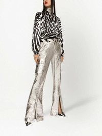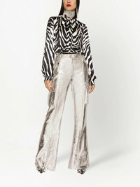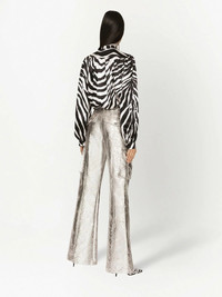 zebra-print satin shirt A recurring theme throughout Dolce & Gabbana collections, animalier motifs are a prime example of the brand's bold design approach. For AW22, this silk shirt is defined by their new season zebra print in line with the house's usual flamboyancy. Highlights - Black/white - Silk satin - Zebra print - Pussy-bow collar - Front button fastening - Long puff sleeves - Buttoned cuffs - Shoulder pads - Straight hem Made in Italy Composition Silk 100%