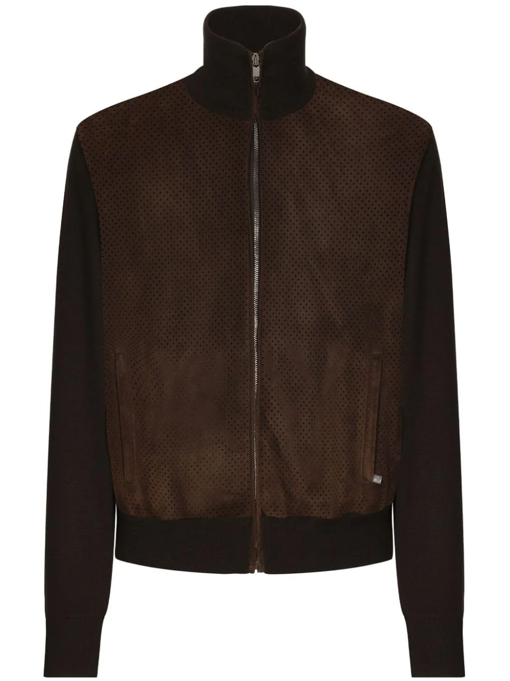zip-up bomber jacket Highlights - Brown - Virgin wool/sheep suede - Panelled design - Perforated detailing - Roll neck - Front zip fastening - Long sleeves - Two side zip-fastening pockets - Ribbed cuffs and hem Made in Italy Composition Virgin Wool 65%, Sheep Suede 35%