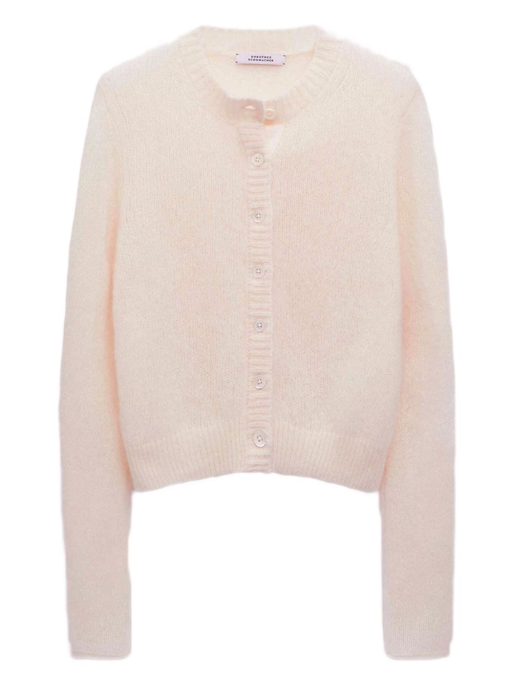 buttoned knitted cardigan Highlights - Cream - Round neck - Button fastening - Ribbed cuffs - Ribbed hem - Merino wool-cashmere blend - Long sleeves Made in Italy Composition Wool 70%, Cashmere 30% Washing instructions Read Manufacturer Guidelines