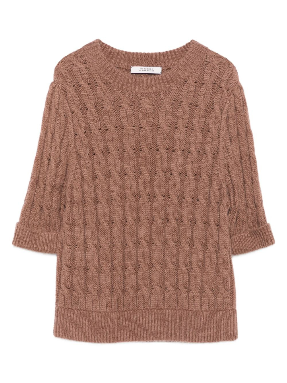cable-knit short-sleeve sweater Highlights - Brown - Cable knit - Round neck - Short sleeve Imported Composition Polyamide 35%, Lyocell 30%, Merino 20%, Alpaca Wool 15% SIZE & FIT Model measurements Height 5 ft 10 in(1.77 m) Bust/Chest 33.07 in(84 cm) Hips 37 in(94 cm) Waist 24.8 in(63 cm) Washing instructions Dry Clean Only