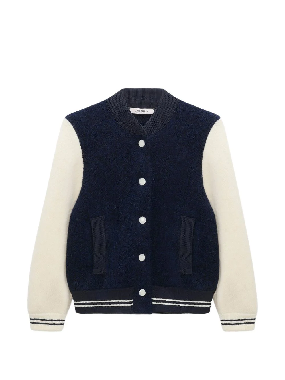 College Allure panelled ribbed jacket Highlights - Navy blue and white - Two-tone design - Ribbed trim - Round neck - Front button-fastening - Front welt-pockets Imported Composition Virgin Wool 50%, Alpaca 32%, Polyamide 18% Washing instructions Hand Wash