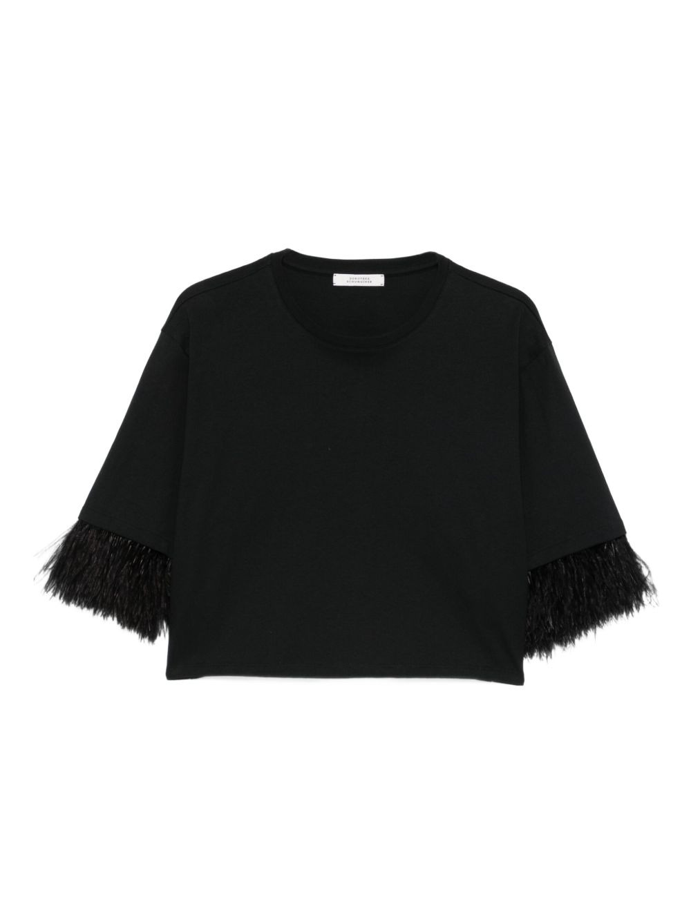 feather-trimmed cotton top Highlights - Black - Feather trim - Short sleeves - Round neck - Cropped - Cotton Imported Composition Cotton 100%, Ostrich Feather 100% SIZE & FIT Model measurements Height 5 ft 10 in(1.78 m) Bust/Chest 33.46 in(85 cm) Hips 36.22 in(92 cm) Waist 23.22 in(59 cm) Washing instructions Machine Wash