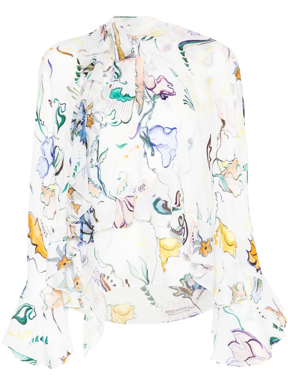 floral-print blouse Highlights - White - Front button fastening - Layered design - Ruffled detailing Imported Composition Silk 100% SIZE & FIT Model measurements Height 5 ft 10 in(1.77 m) Bust/Chest 29.92 in(76 cm) Hips 34.25 in(87 cm) Waist 23.62 in(60 cm) FittingInformation Designed to be unstructured, offering a loose fit throughout