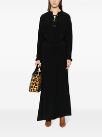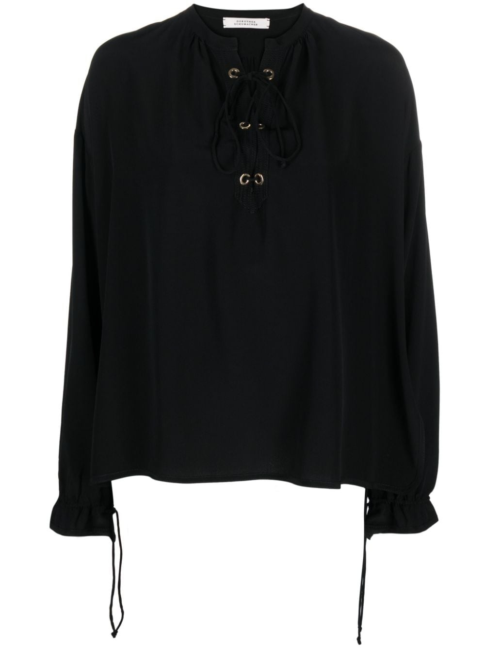 lace-up neckline silk blouse Highlights - Black - Silk - Crepe de chine - Band collar - Metal eyelet detailing - Gathered neckline - Front lace-up fastening - Long sleeves - Straight hem Imported Composition Silk 100% Body: Silk 100% SIZE & FIT Model measurements Height 5 ft 10 in(1.77 m) Bust/Chest 31.1 in(79 cm) Hips 35.03 in(89 cm) Waist 23.62 in(60 cm) Measurement LENGTH 27.55 in(70 cm) FittingInformation Designed to be unstructured, offering a loose fit throughout Made from a midweight non-stretch fabric This piece fits true to size – take your usual size Washing instructions Dry Clean Only