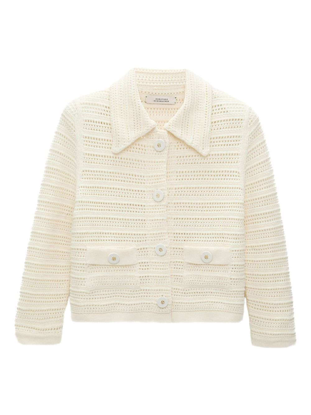 open-knit buttoned cardigan Highlights - Off-white - Open knit - Three-quarter sleeves - Button fastening - Flap pockets - Collared neckline Imported Composition Cotton 69%, Polyamide 30%, Elastane 1% Washing instructions Read Manufacturer Guidelines