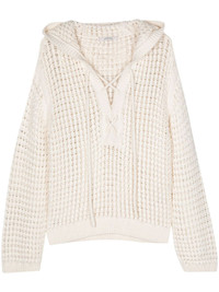 open-knit hooded sweater Highlights - Cream white - Cotton blend - Knitted construction - Open knit - Classic hood - Long sleeves - V-neck - Straight hem - Front tie fastening Made in Italy Composition Cotton 81%, Polyamide 18%, Spandex/Elastane 1% Washing instructions Dry Clean Only