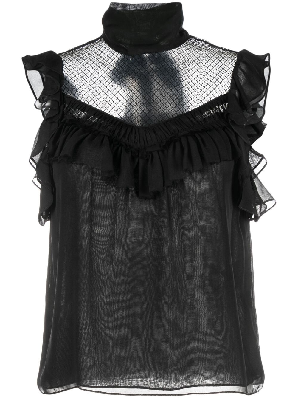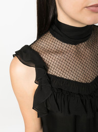 panelled sleeveless silk chiffon blouse Highlights - Black - Silk - Chiffon - Ruffled detailing - Sheer panelling - Sleeveless - High neck - Flared hem Imported Composition Silk 100% SIZE & FIT Model measurements Height 5 ft 11 in(1.8 m) Bust/Chest 33.07 in(84 cm) Hips 37.4 in(95 cm) Waist 25.19 in(64 cm)