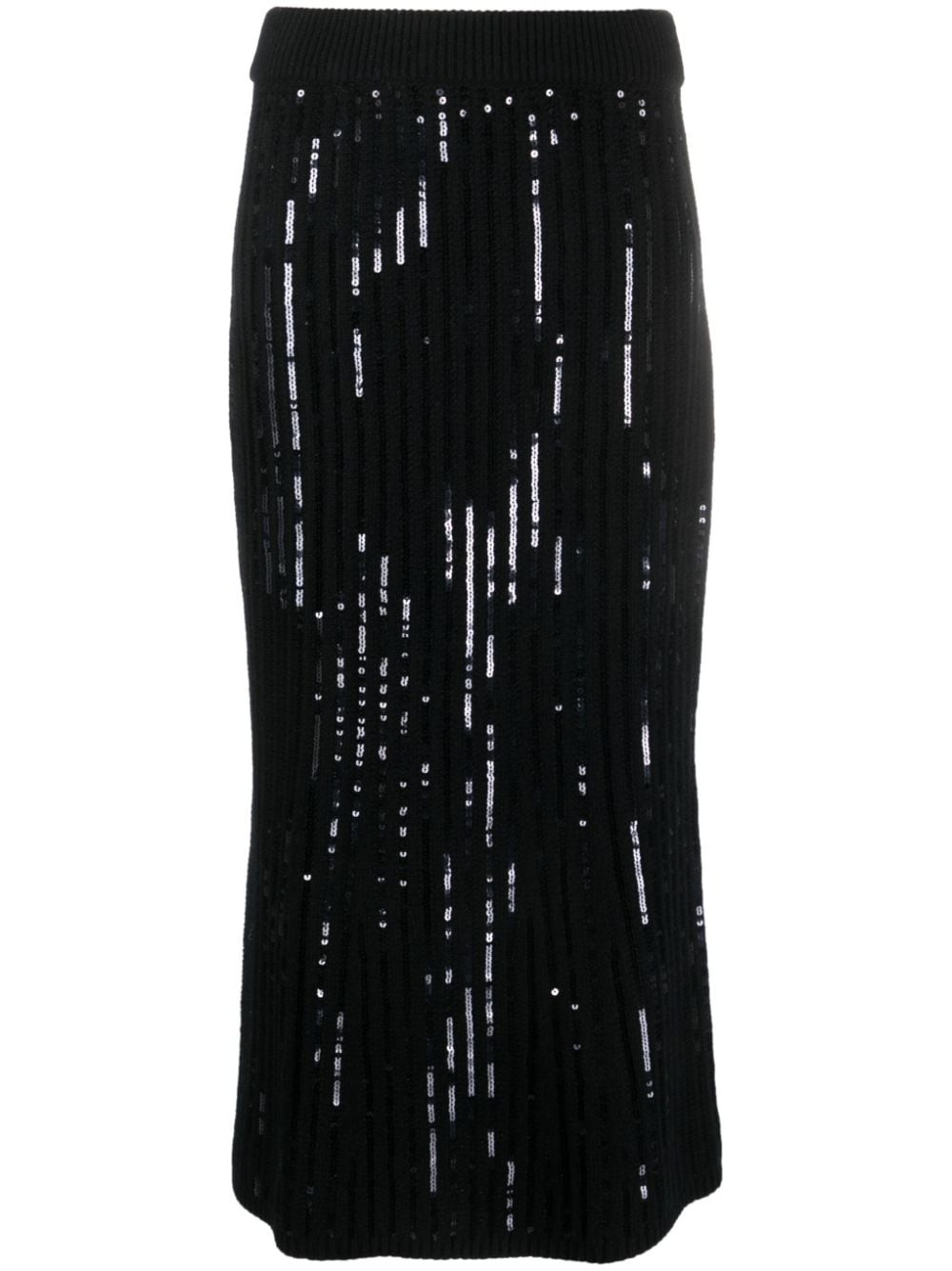 sequin-embellished high-waisted skirt black wool-cashmere blend knitted construction sequin embellishment high-waisted straight hem mid-length Imported Composition Wool 70%, Cashmere 30% SIZE & FIT Model measurements Height 5 ft 11 in(1.8 m) Bust/Chest 33.07 in(84 cm) Hips 37.4 in(95 cm) Waist 25.19 in(64 cm) FittingInformation Made with a midweight knit, this piece offers some stretch This piece fits true to size – take your usual size