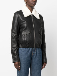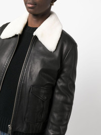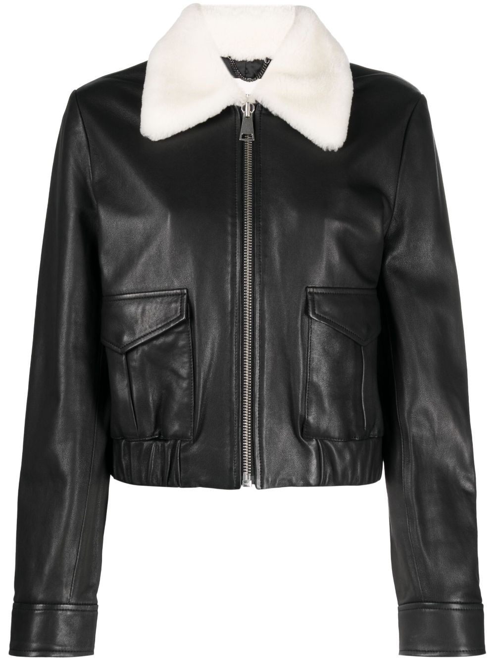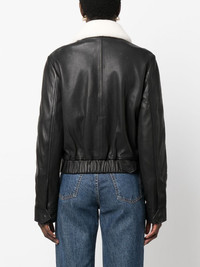 shearling-collar leather jacket Highlights - Black/white - Leather - Shearling collar - Front zip fastening - Two front flap pockets - Long sleeves - Buttoned cuffs - Cropped - Elasticated hem - Straight hem Made in Italy Composition Outer: Lamb Skin 100%, Sheep Skin/Shearling 100% Lining: Polyester 100% Body: Lambskin 100% SIZE & FIT Model measurements Height 5 ft 10 in(1.77 m) Bust/Chest 32.28 in(82 cm) Hips 35.03 in(89 cm) Waist 25.19 in(64 cm) Measurement SLEEVE LENGTH 24.4 in(62 cm) LENGTH 21.25 in(54 cm) FittingInformation Designed for a slim fit that sits just away from the body offering a close yet comfortable fit The elasticated waist allows for a comfortable fit Made from a midweight non-stretch fabric, this piece offers minimal elasticity when worn This piece fits true to size – take your usual size Washing instructions Specialist Cleaning