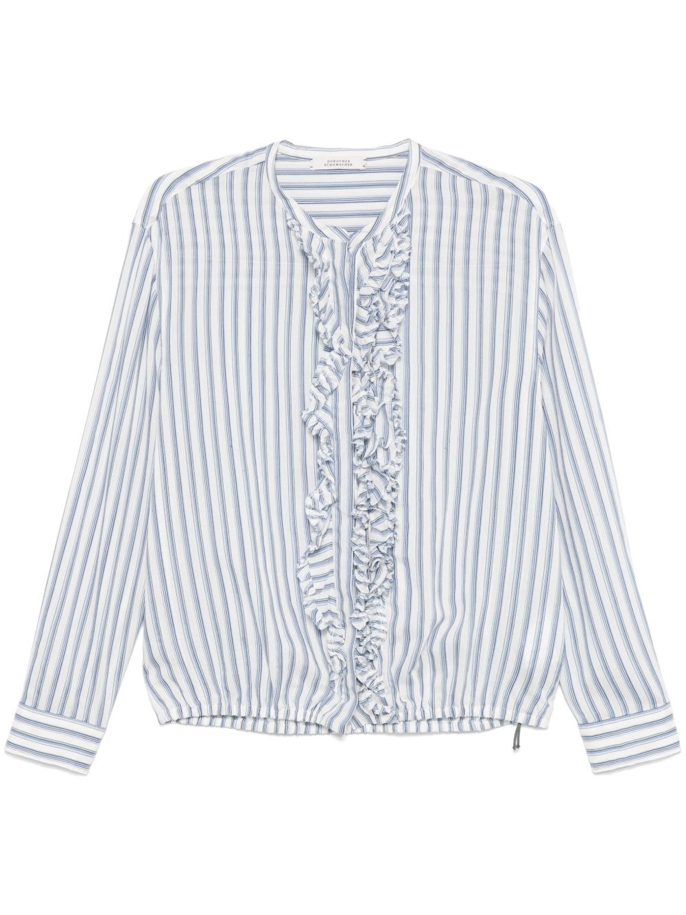 striped shirt Highlights - Sky blue/white - Vertical stripe pattern - Concealed front button placket - Band collar - Ruffled detailing - Drop shoulder - Long sleeves - Buttoned cuffs - Elasticated hem Imported Composition Viscose 100% Body: Polyamide 100% SIZE & FIT Model measurements Height 5 ft 10 in(1.77 m) Bust/Chest 30.7 in(78 cm) Hips 35.03 in(89 cm) Waist 23.62 in(60 cm) FittingInformation Designed for a relaxed fit, this piece allows for comfort and movement when worn The elasticated waist allows for a comfortable fit Made from a midweight non-stretch fabric