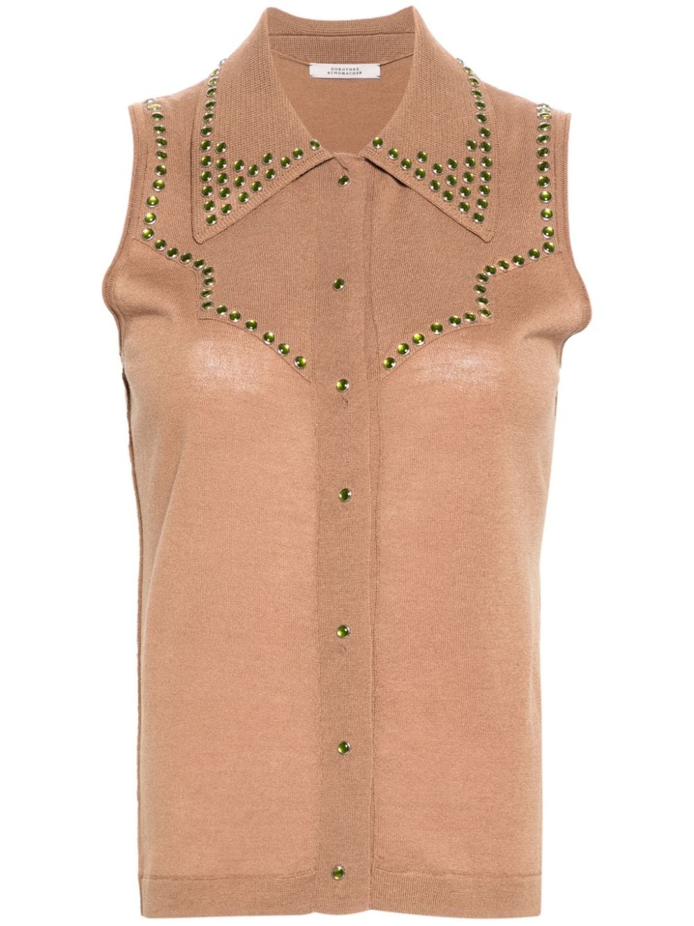 stud-embellished knitted top Highlights - Brown - Virgin wool - Knitted construction - Yoke design - Stud embellishment - Classic collar - Sleeveless - Straight hem - Front press-stud fastening Imported Composition Virgin Wool 100% SIZE & FIT Model measurements Height 5 ft 9 in(1.75 m) Bust/Chest 34.64 in(88 cm) Hips 36.61 in(93 cm) Waist 26.37 in(67 cm) FittingInformation Designed for a slim fit that sits just away from the body offering a close yet comfortable fit Made with a midweight knit, this piece offers some stretch This piece fits true to size – take your usual size