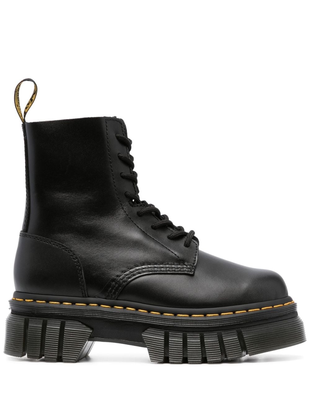 Audrick 8-Eye Lux boots Sitting atop a ridged rubber sole and cushioned EVA midsole, Dr. Martens' Audrick 8-Eye Lux boots depict the brand's signature punk-inspired take on footwear. The pair is elevated with recognisable details, like an AirWair heel loop and contrasting yellow Goodyear welt stitching. Highlights - Black - Nappa leather - Airwair heel loop - Front lace-up fastening - Round toe - Goodyear welt - Signature quad platform - Eva midsole - Ridged rubber sole Made in United Kingdom Composition Lining: Fabric 100%, Calf Leather 100% Sole: Rubber 100% Outer: Calf Leather 100% SIZE & FIT Measurement HEEL 2.36 in(6 cm) HEIGHT 5.9 in(15 cm) Sole height 1.77 in(4.5 cm)