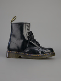 lace-up boot Black faux leather boots from Dr.Martens featuring a round toe, a front lace-up fastening, curved paneling to the sides, a contrasting yellow pull tab at the opening and a nude ribbed rubber sole with yellow stitching. Imported Composition Artificial Leather 100% SIZE & FIT Measurement HEEL 1.18 in(3 cm)