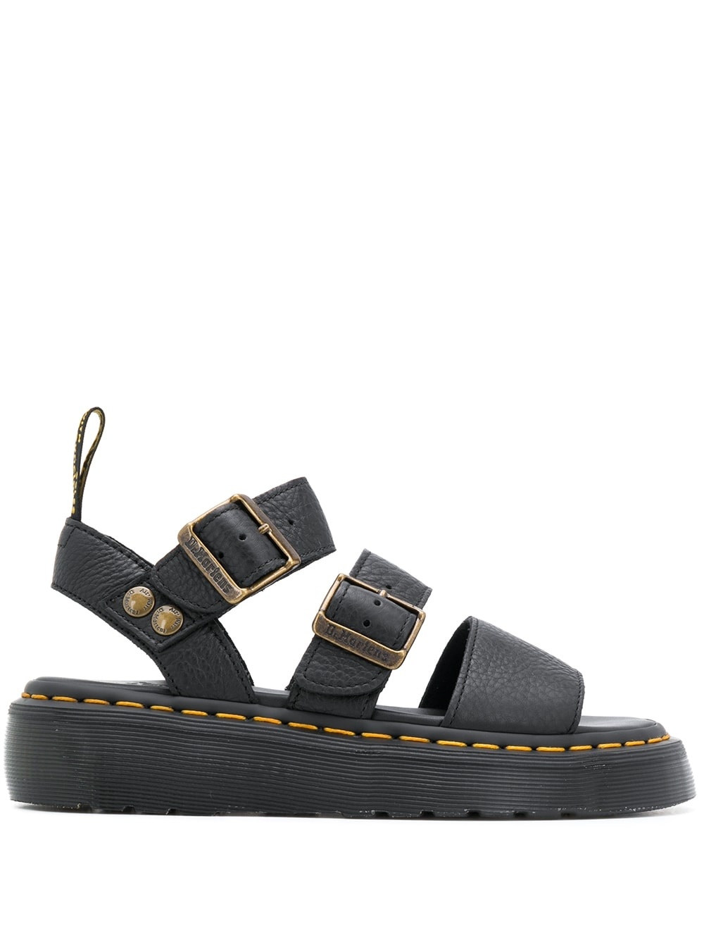 open toe buckled sandals Black leather open toe buckled sandals from Dr. Martens featuring an open toe, a flat sole, a side buckle fastening, a stitch detail and a branded insole. Imported Composition Leather 100% SIZE & FIT Measurement HEEL 1.77 in(4.5 cm) Sole height 1.18 in(3 cm)