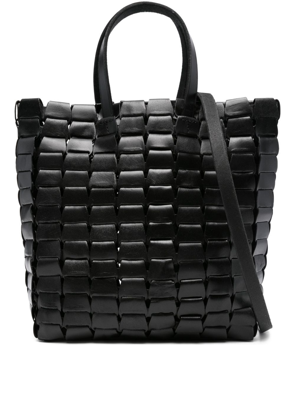 leather woven tote bag Highlights - Black - Leather - Woven design - Two top handles - Detachable shoulder strap - Rectangular shape Imported Composition Outer: Leather 100% SIZE & FIT Measurement DEPTH 3.93 in(10 cm) HANDLE 4.72 in(12 cm) HEIGHT 9.84 in(25 cm) WIDTH 9.84 in(25 cm)