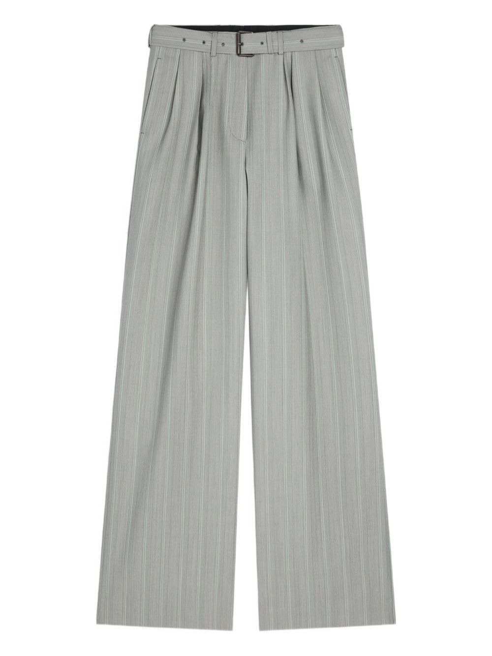 belted pinstripe trousers Highlights - Grey - Pinstripe pattern - Belted waist - Pleated detailing Imported Composition Wool 68%, Polyester 30%, Silk 2% Washing instructions Read Manufacturer Guidelines