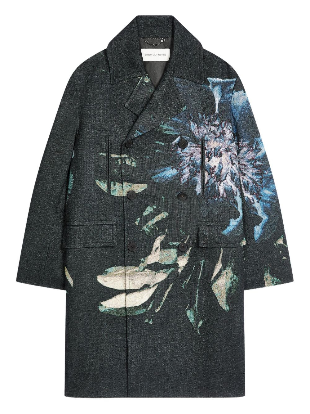 double-breasted coat Highlights - Black - Floral motif - Button front fastening - Long sleeves - Two side flap pockets - Two slit chest pockets Imported Composition Polyester 49%, Cotton 37%, Acetate 9%, Other fibres 5% Washing instructions Dry Clean Only