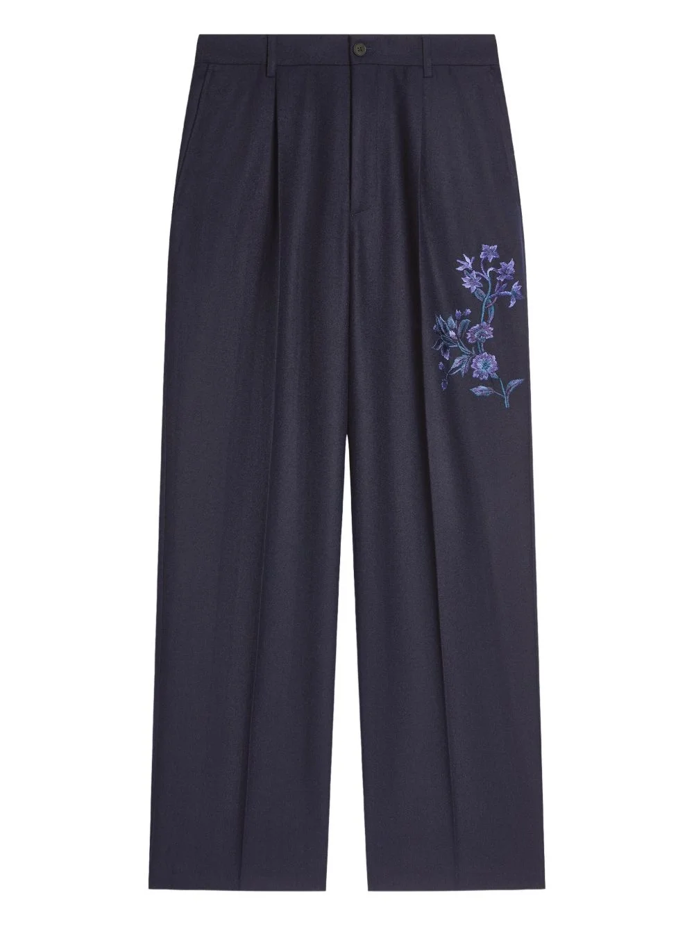 floral-embroidered wool trousers Highlights - Navy blue - Wool - Dart detailing - Floral embroidery - Button fly fastening Imported Composition Wool 100% Washing instructions Read Manufacturer Guidelines