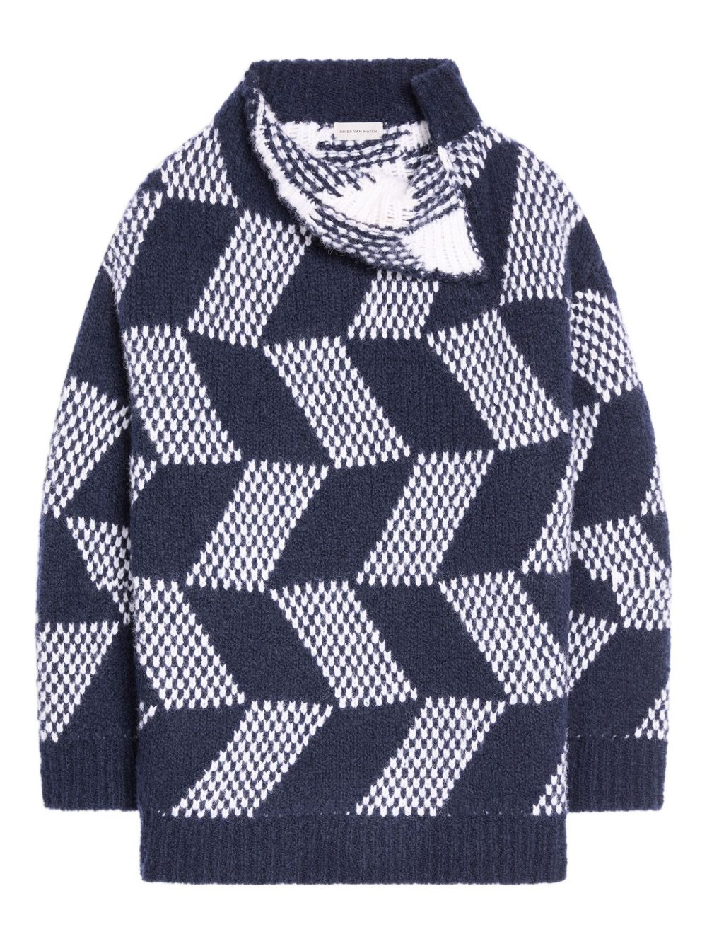 geometric-pattern sweater Highlights - Navy blue - Geometric pattern - Asymmetric neck - High neck - Long sleeves - Ribbed cuffs and hem Imported Composition Wool 63%, Alpaca Wool 30%, Nylon 7% Washing instructions Read Manufacturer Guidelines