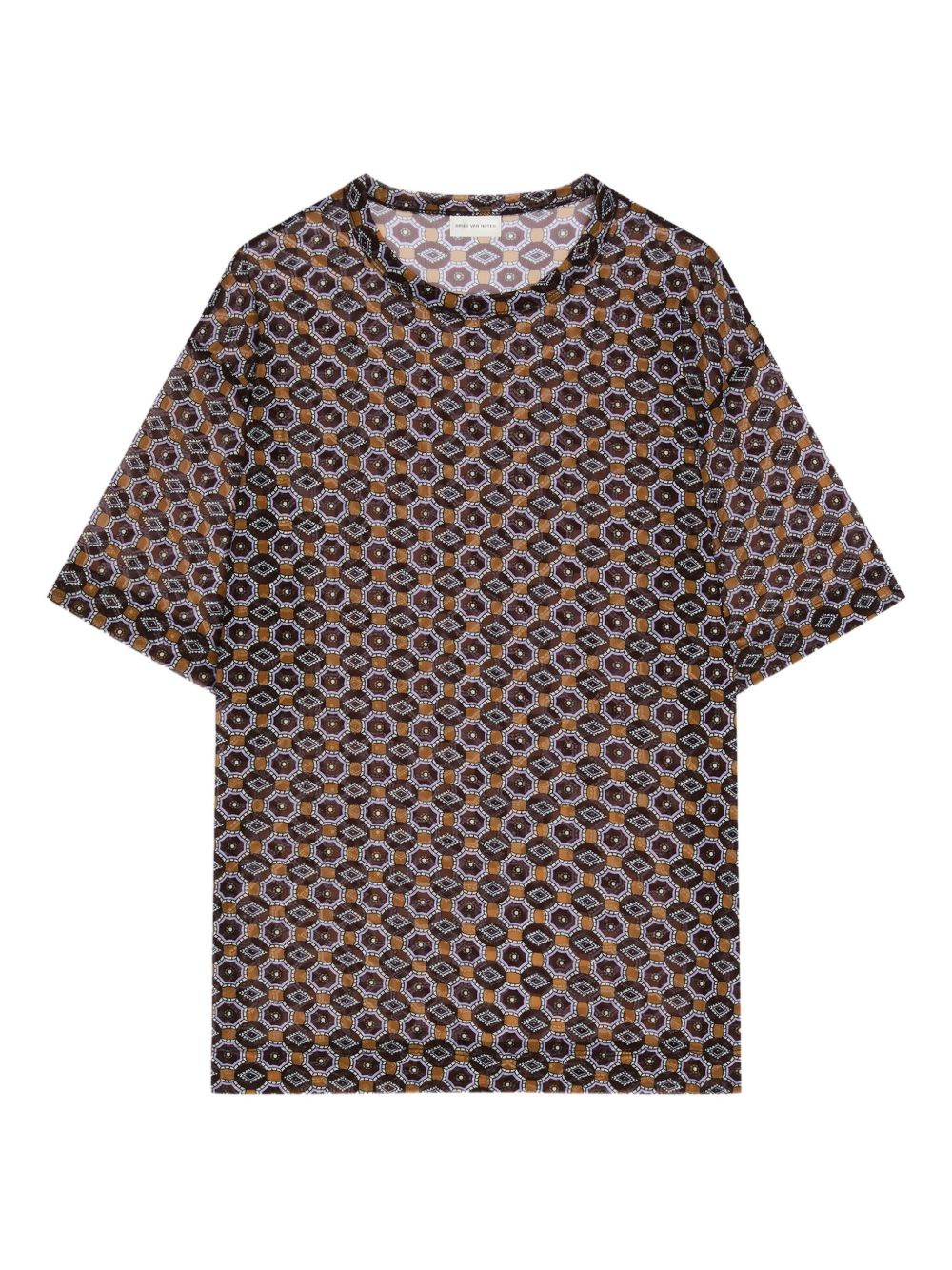 geometric-print semi-sheer top Highlights - Brown - Geometric print - Short sleeves - Crew neck - Semi-sheer Imported Composition Nylon 94%, Elastane 6% Washing instructions Read Manufacturer Guidelines