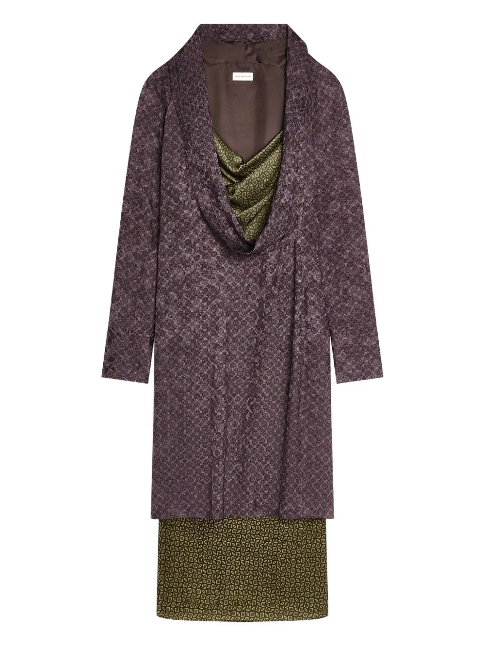 layered patterned midi dress Highlights - Burgundy and green - Geometric print - Cowl neck - Long sleeves - Double layer - Midi length Imported Composition Viscose 63%, Silk 37% Washing instructions Read Manufacturer Guidelines